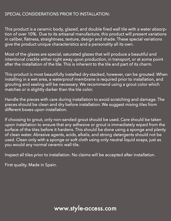 – Dry-stacking is recommended for wall tile, although not required. When installing in a wet area, a waterproof member is required prior to installation,and grouting and sealing will be necessary.